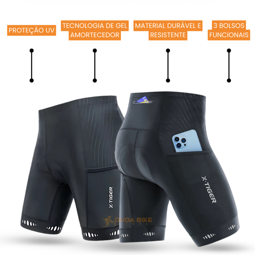 Gel de extremo conforto, suporta até 6hrs seguidas de pedal. Três bolsos amplos. Elastano UV Premium, não fica transparente.